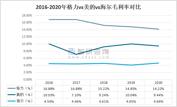 從毛利率來看,格力集團毛利率明顯高于美的集團、海爾智家,格力集團毛利率14.22%,較上年下降0.63個百分點;美的集團毛利率9.44%,較上年下降0.6個百分點;海爾智家毛利率4.69%,較上年提升0.64個百分點。