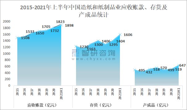 2015-2021年上半年中國造紙和紙制品業(yè)應(yīng)收賬款、存貨及產(chǎn)成品統(tǒng)計(jì)