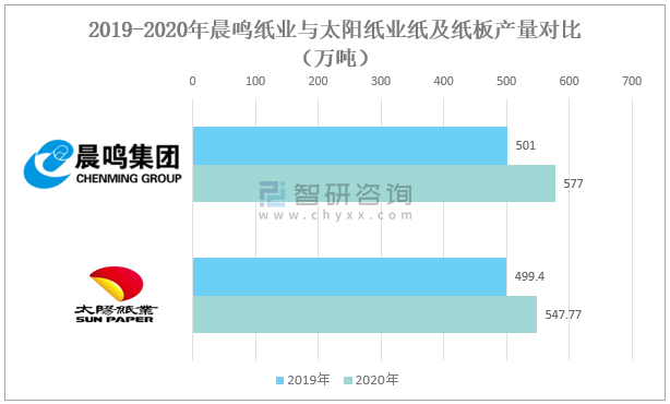 2019-2020年晨鳴紙業(yè)與太陽紙業(yè)紙及紙板產(chǎn)量對比(萬噸)