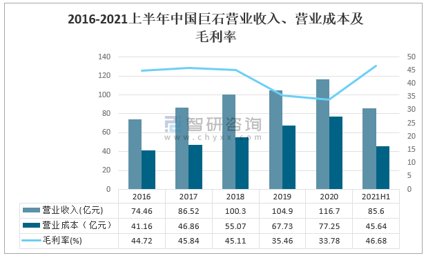 2016-2021上半年中國巨石營業收入、營業成本及毛利率