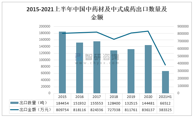2015-2021上半年中國中藥材及中式成藥出口數量及金額