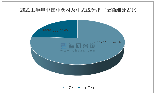 中國海關數據顯示,2021上半年中國中藥材出口金額為291227萬元,占總出口金額的76%;中國中式成藥出口金額為92098萬元,占總出口金額的24%。