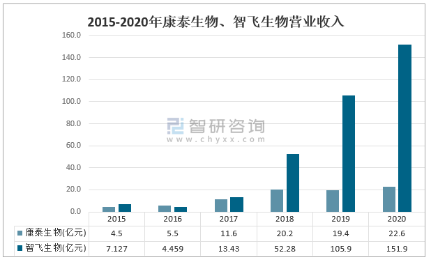 2015-2020年康泰生物、智飛生物營業收入