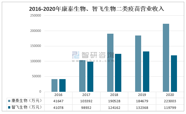 2020年康泰生物二類疫苗營業收入為223003萬元,同比增長20.8%;智飛生物二類疫苗營業收入為119799萬元,同比下降9.5%。