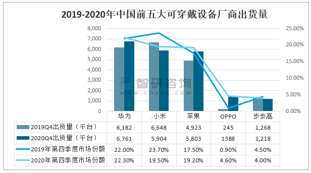 2019-2020年中國前五大可穿戴設備廠商出貨量
