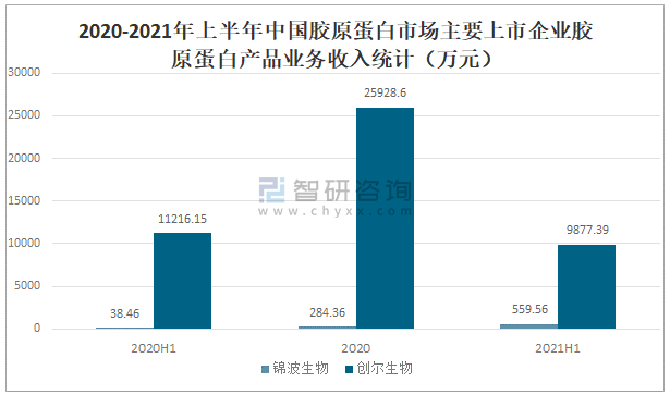 2020-2021年上半年中國膠原蛋白市場主要上市企業膠原蛋白產品業務收入統計(萬元)