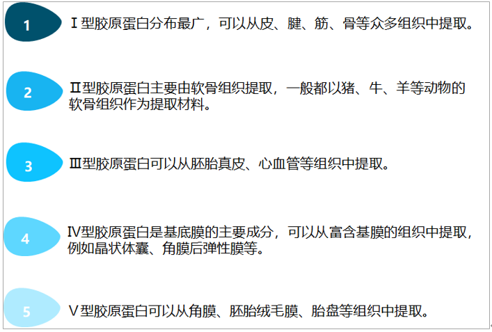 膠原蛋白根據其基因編碼組合的不同可以分為許多類型,目前已發現了28種膠原蛋白的類型。不同類型的膠原蛋白在動物體內分布各異,其含量也有很大差別。Ⅰ型膠原蛋白分布最廣,可以從皮、腱、筋、骨等眾多組織中提取;Ⅱ型膠原蛋白主要由軟骨組織提取,一般都以豬、牛、羊等動物的軟骨組織作為提取材料;Ⅲ型膠原蛋白可以從胚胎真皮、心血管等組織中提?。虎粜湍z原蛋白是基底膜的主要成分,可以從富含基膜的組織中提取,例如晶狀體囊、角膜后彈性膜等;Ⅴ型膠原蛋白可以從角膜、胚胎絨毛膜、胎盤等組織中提取。此外還有許多其他類型的膠原蛋白,廣泛分布在不同的機體、不同的組織內,可以通過適當的工藝來提取、純化,同時也有部分膠原蛋白尚處于研究階段,迄今為止還未探究出完整的制備方法。