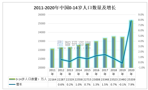 2011-2020年中國0-14歲人口數量及增長