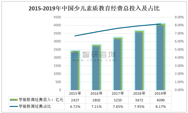 新時代,經濟社會高質量發展,青少年兒童的成長成為了社會關注的焦點,在素質教育的導向下,通過興趣培訓、技能學習等方式能夠有效的提升學生的綜合素質和核心素養。數據顯示,財政經費在少兒素質教育扶持力度是比較大的,尤其是學前學段的投入及占比逐年上升。2019年中國學前素質教育經費總投入為4099億元,較2018年增長427億元;2019年中國學前教育經費占比8.17%,較2018年增加2.8個百分點。