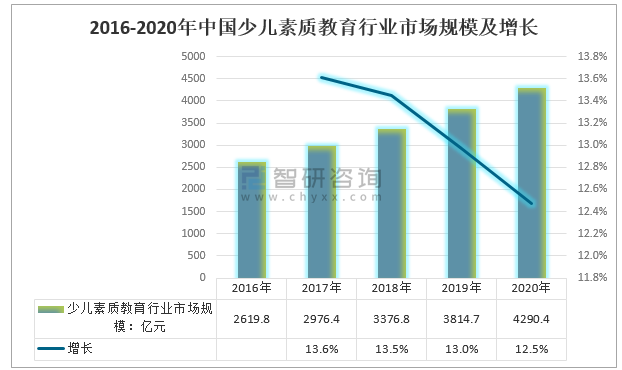 智研咨詢發布的《2021-2027年中國少兒素質教育行業市場發展潛力及投資前景分析報告》顯示:改革開放以來,中國教育發展取得令人矚目的成就,隨著社會經濟的發展,國家教育水平的不斷提高,人們越來越關注下一代的素質教育問題。近年來,國內少兒素質教育市場規模以13.1%的年復合增長率逐年增長,2020年,國內少兒素質教育市場規模達到4290.4億元,同比增長12.5%,呈現出少兒素質教育行業穩步上升的態勢。