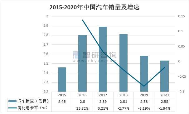 2015-2020年中國汽車銷量及增速
