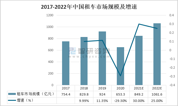 2017-2022年中國租車市場規模及增速