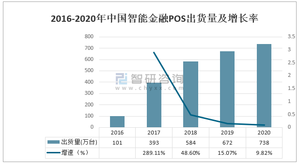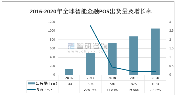 2016-2020年全球智能金融POS出貨量及增長率