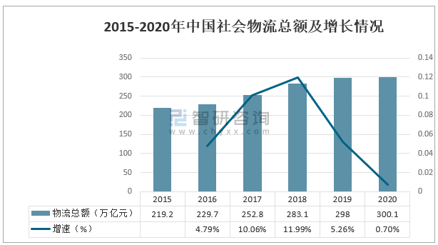 2020年疫情得到基本控制和經濟社會的進一步發展,我國物流行業運行持續穩定恢復。2020年全國社會物流總額再上三百萬億元新臺階,達到300.1萬億元,物流規模增長持續恢復,四季度增速回升進一步加快。