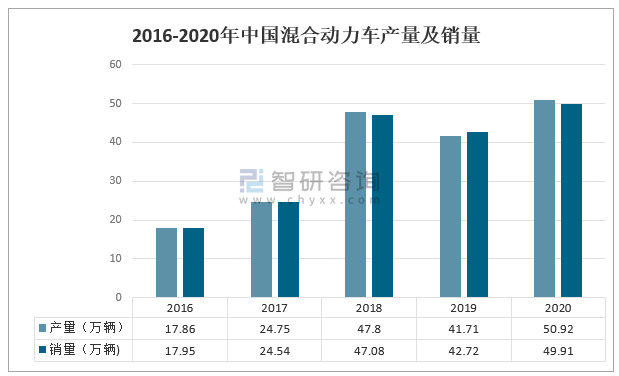 智研咨詢發布的《2021-2027年中國混合動力車行業市場研究分析及投資戰略規劃報告》數據顯示:2020年12月31日,財政部、工信部等四部委聯合下發《關于進一步完善新能源汽車推廣應用財政補貼政策的通知》,正式發布2021年新能源汽車國家補貼政策。中國混合動力車產量呈上升走勢,2020年中國混合動力車產量為50.92萬輛,同比增長22.1%;中國混合動力車銷量為49.91萬輛,同比增長16.8%。