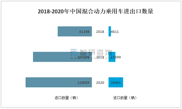 目前,中國混合動力乘用車進口數量較多,其中2020年中國混合動力乘用車進口數量為119059輛,同比增長12.7%;混合動力乘用車出口數量為26461輛,同比增長108.4%。