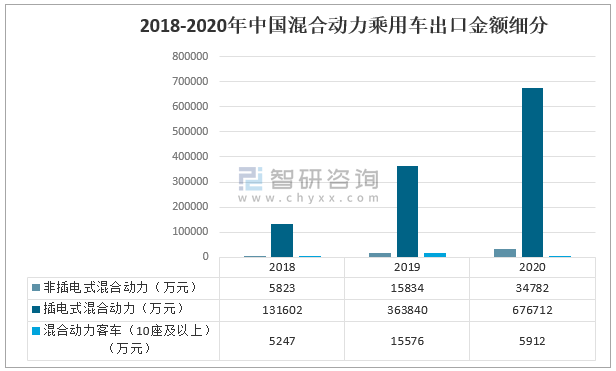 2020年中國非插電式混合動力乘用車出口金額為34782萬元,同比增長119.7%;插電式混合動力乘用車出口金額為676712萬元,同比增長86%;混合動力客車出口金額為5912萬元,同比下降62%。