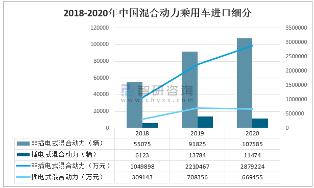 其中2020年中國非插電式混合動力乘用車進口數量為107585輛,進口金額為2879224萬元;插電式混合動力乘用車進口數量為11474輛,進口金額為669455萬元。