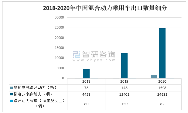 中國海關數據顯示,2020年中國非插電式混合動力乘用車出口數量為1698輛,同比增長1047.3%;插電式混合動力乘用車出口數量為24681輛,同比增長99%;混合動力客車出口數量為82輛,同比下降45.3%。