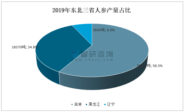目前中國人參主產區東北三省中,吉林省人參產量占據明顯主導地位。2019年吉林省人參產量占比占東北三省的58.3%。