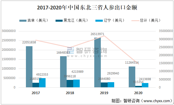 2017-2020年中國東北三省人參出口金額