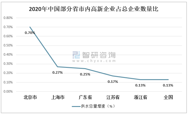 從自身省市內(nèi)高新企業(yè)占總企業(yè)數(shù)量比來看,上海市的高新企業(yè)占比在五個省份中居于第二名達到了0.27%。