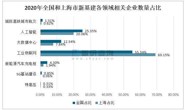 2020年全國和上海市新基建各領(lǐng)域相關(guān)企業(yè)數(shù)量占比
