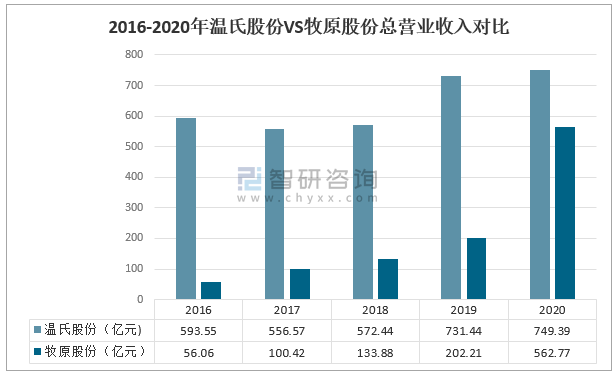 2016-2020年溫氏股份VS牧原股份總營業收入對比