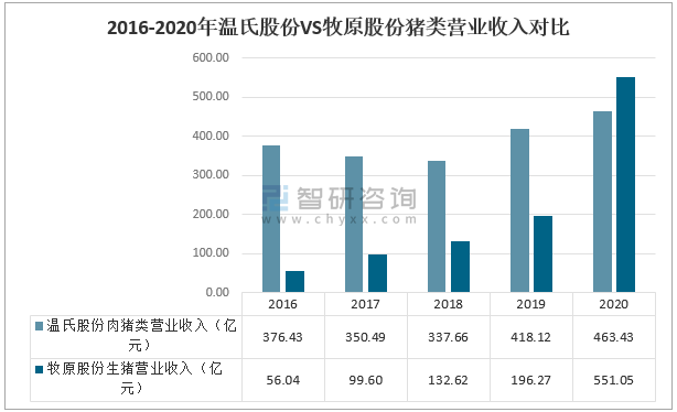 2016-2020年溫氏股份VS牧原股份豬類營業收入對比