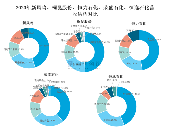 2020年新鳳鳴、桐昆股份、恒力石化、榮盛石化、恒逸石化營收結構對比