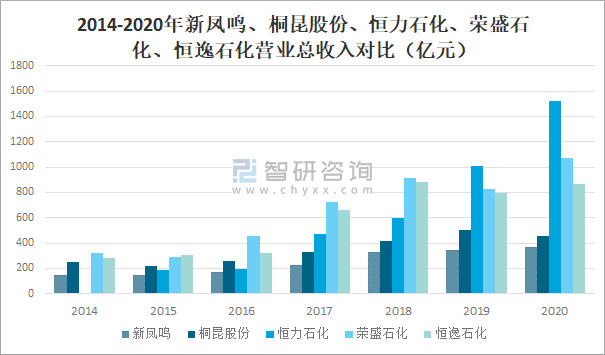 2014-2020年新鳳鳴、桐昆股份、恒力石化、榮盛石化、恒逸石化營業總收入對比(億元)