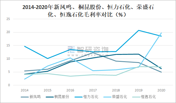 2014-2020年新鳳鳴、桐昆股份、恒力石化、榮盛石化、恒逸石化毛利率對比(%)