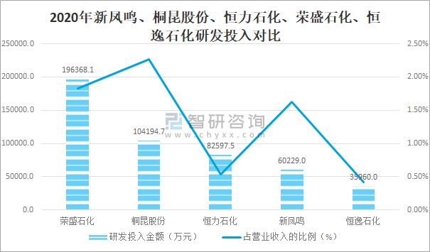 2020年新鳳鳴、桐昆股份、恒力石化、榮盛石化、恒逸石化研發投入對比