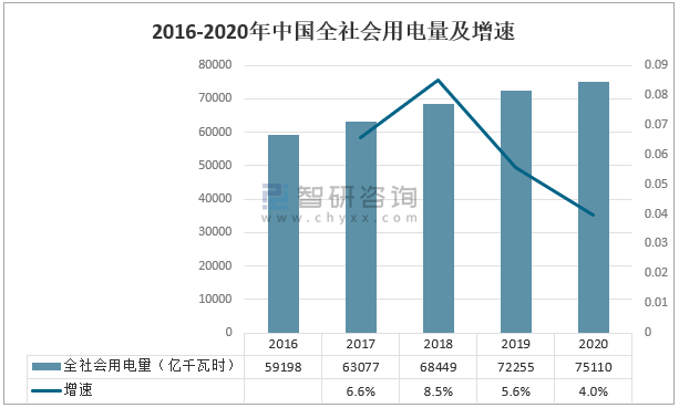 2016-2020年中國(guó)全社會(huì)用電量及增速
