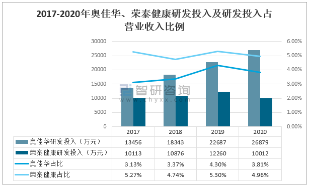 2017-2020年奧佳華、榮泰健康研發投入及研發投入占營業收入比例