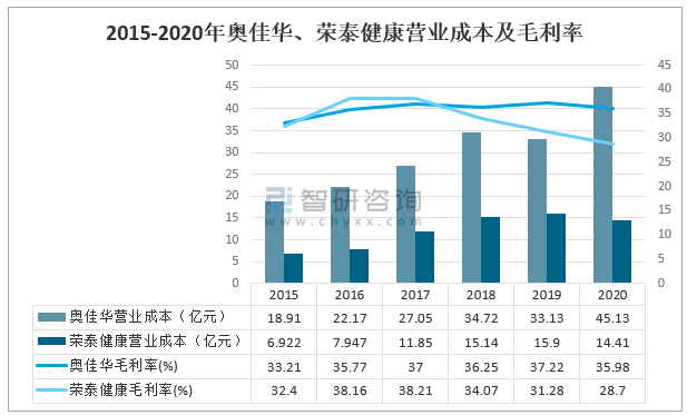 2015-2020年奧佳華、榮泰健康營業成本及毛利率