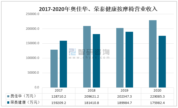智研咨詢發布的《2021-2027年中國按摩器行業市場全景調查及投資潛力研究報告》數據顯示:上海榮泰健康科技股份有限公司成立于2002年,品牌創立于1997年。2020年榮泰健康營業收入為20.21億元,同比下降12.7%;奧佳華智能健康科技集團股份有限公司是中國領先的集品牌、營銷、研發、制造、服務為一體的國際化智能健康產業集團,是國內按摩器具行業產業鏈完整并在全球具有影響力的企業,2020年奧佳華營業收入為70.49億元,同比增長33.6%。