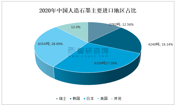 據中國海關數據,2020年中國人造石墨主要進口地區有瑞士、韓國及日本等,從美國地區人造石墨進口數量6354噸,占總進口數量的28.69%。