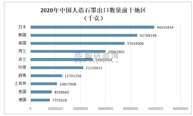 2020年中國人造石墨出口數量最多地區為日本49555934千克;其次是韓國地區人造石墨出口數量42769146千克。