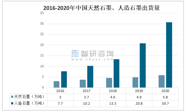 智研咨詢發布的《2021-2027年中國石墨行業市場全景評估及發展前景展望報告》數據顯示:廣義上,一切通過有機炭化再經過石墨化高溫處理得到的石墨材料均可稱為人造石墨,如炭纖維、熱解炭、泡沫石墨等。2020年中國人造石墨出貨量約為30.7萬噸,同比增長47.6%;天然石墨出貨量為5.8萬噸,同比增長18.4%。