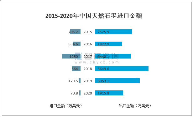 據中國海關數據,2020年中國天然石墨進口金額為70.8萬美元,同比下降45.3%;天然石墨出口金額為1915.8萬美元,同比下降37.3%。