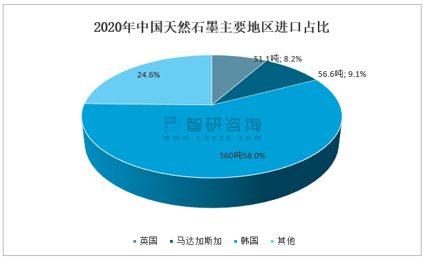 中國海關數據顯示,2020年中國天然石墨主要進口地區有英國、馬達加斯加及韓國等。其中韓國地區天然石墨進口數量為360噸,占天然石墨的58%。