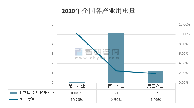 根據中國電力企業聯合會數據, 2020年,第一產業用電量859億千瓦時,同比增長10.2%,第一產業用電量的快速增長主要是近年來國家加大農網改造升級力度,村村通動力電,鄉村用電條件持續改善,電力逐步代替人力和畜力,電動機代替柴油機,以及持續深入推進脫貧攻堅戰,帶動鄉村發展,促進第一產業用電潛力釋放。第二產業用電量5.1萬億千瓦時,同比增長2.5%,復工復產持續推進拉動第二產業用電量增速持續回升。第三產業用電量1.2萬億千瓦時,同比增長1.9%,隨著復商復市的持續推進,第三產業用電量增速逐季上升。
