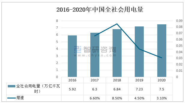 2016-2020年中國全社會用電量持續增長,2020年,全社會用電量7.5萬億千瓦時,同比增長 3.1%,“十三五”時期全社會用電量年均增長5.7%。