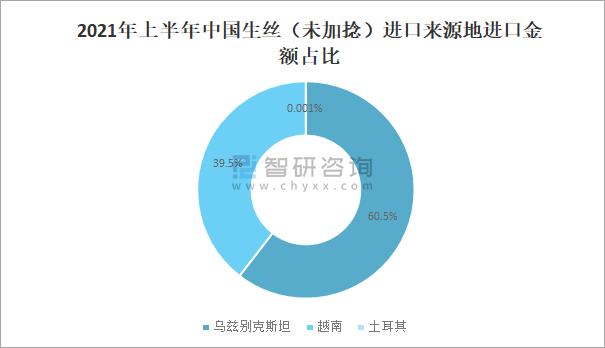 2021年上半年中國從烏茲別克斯坦進口生絲(未加捻)的進口金額占全國生絲(未加捻)的進口總額的60.5%,占比最大;從越南進口生絲(未加捻)的進口金額占全國生絲(未加捻)的進口總額的39.5%;從土耳其進口生絲(未加捻)的進口金額占全國生絲(未加捻)的進口總額的0.001%。