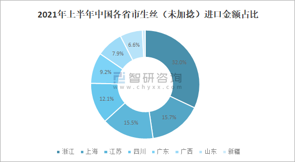 2021年上半年浙江生絲(未加捻)進口金額占全國生絲(未加捻)進口總額的32.0%,占比最大;上海生絲(未加捻)進口金額占全國生絲(未加捻)進口總額的15.7%;江蘇生絲(未加捻)進口金額占全國生絲(未加捻)進口總額的15.5%;四川生絲(未加捻)進口金額占全國生絲(未加捻)進口總額的12.1%。