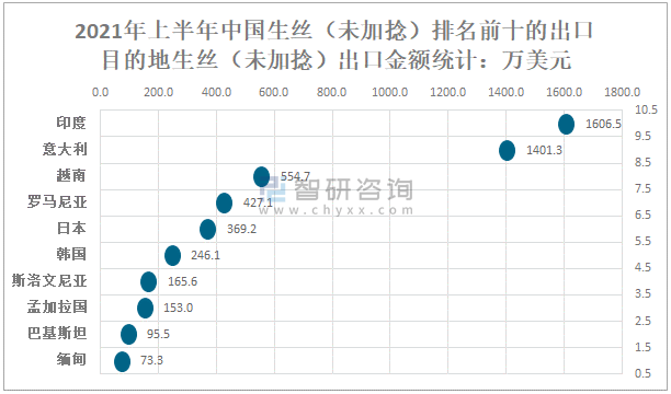 從出口目的地來看,2021年上半年中國出口至印度生絲(未加捻)的出口金額為1606.5萬美元;出口至意大利生絲(未加捻)的出口金額為1401.3萬美元;出口至越南生絲(未加捻)的出口金額為554.7萬美元。