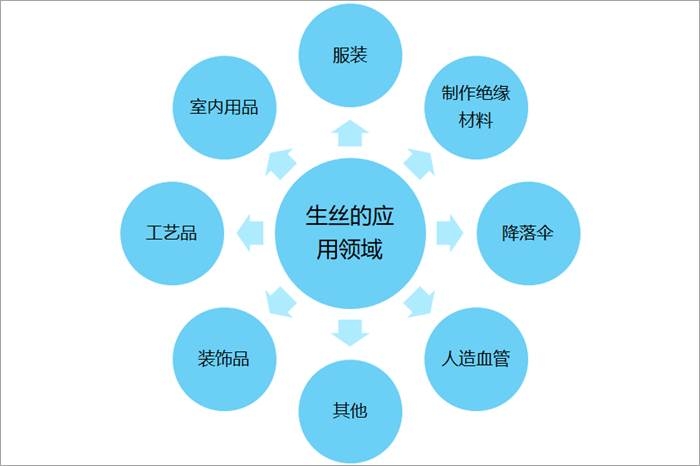 生絲柔軟滑爽,手感豐滿,強伸度好,富有彈性,光澤柔和,吸濕性強,對人體無刺激性,是高級紡織材料,可以織制組織結(jié)構(gòu)不同的各類絲織品,用作服裝、室內(nèi)用品、工藝品、裝飾品等。生絲還具有很高的比強度、優(yōu)良的電絕緣性、好的絕熱性和易燃但燃燒緩慢的特性,在工業(yè)、國防和醫(yī)學方面都有重要用途,如制作絕緣材料、降落傘、人造血管等。