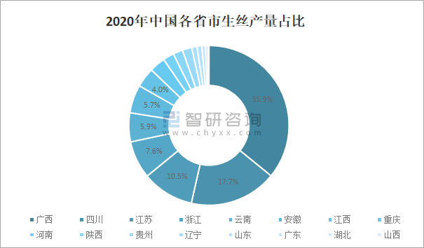 中國生絲主要集中在廣西、四川、江蘇等地,2020年廣西、四川、江蘇三個省份生絲產(chǎn)量總和占全國生絲總產(chǎn)量的64.0%,其中廣西生絲產(chǎn)量占全國生絲總產(chǎn)量的35.9%,占比最大;四川生絲產(chǎn)量占全國生絲總產(chǎn)量的17.7%;江蘇生絲產(chǎn)量占全國生絲總產(chǎn)量的10.5%。