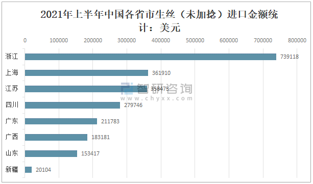 分省市來看,2021年上半年浙江生絲(未加捻)進口金額為739118美元,全國排名第一;上海生絲(未加捻)進口金額為361910美元,全國排名第二;江蘇生絲(未加捻)進口金額為358475美元,全國排名第三。